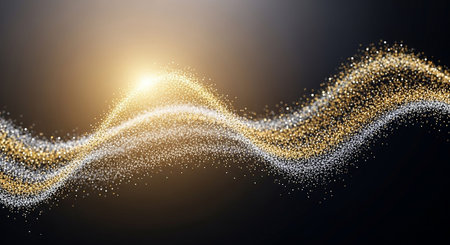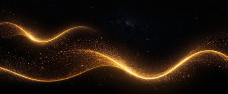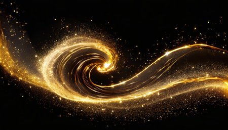 This stunning image features a mesmerizing display of golden sparkle trail dust in a swirl wave style. The radiant gold particles create a dynamic and enchanting atmosphere, ideal for various creative projects.