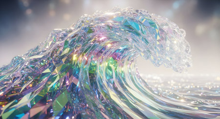 A close-up of a breaking wave made of shimmering, iridescent crystal, reflecting rainbow colors and light.