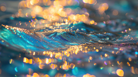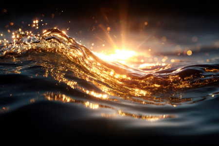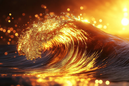 Golden Sparkling Ocean Wave at Sunset with Bokeh Effect