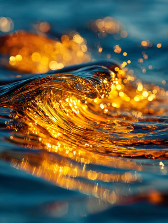 Shimmering surface of water reflects golden hues, creating mesmerizing pattern of light and movement. tranquil waves evoke sense of calm and beauty in nature
