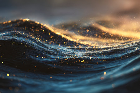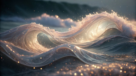 Close-up of translucent ocean waves, illuminated by sunlight creating a golden glow. The water appears almost ethereal, with sparkling particles. The background is a darker ocean the overall atmosphere is peaceful and magical. No people are present.