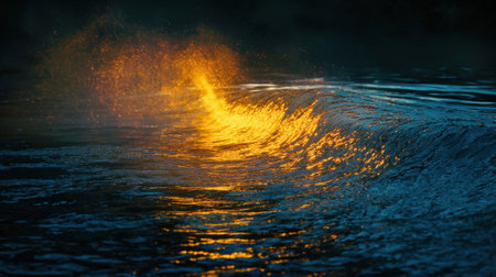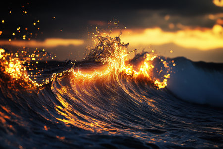 A radiant sunset bathes the ocean in warm golden hues, as a cresting wave sparkles with glistening droplets, forming a mesmerizing and lively marine tableau.