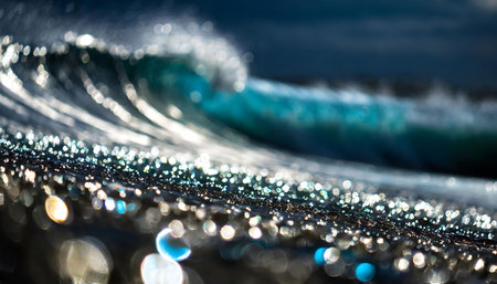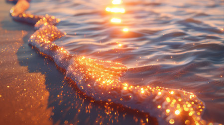 Dynamic ocean wave with sparkling bokeh lights at sunset. That the image is generated using AI.