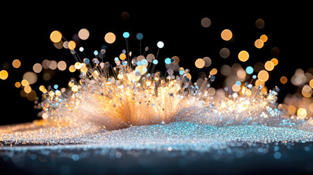 This captivating image features an explosion of shimmering particles on a surface, creating a vibrant and colorful abstract display of light and elegance.