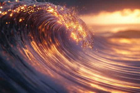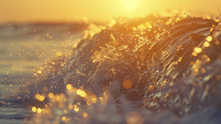 A mesmerizing ocean wave forms and sparkles as the sunset casts golden hues across the water. Tiny droplets reflect the sunlight, creating a magical seaside atmosphere.