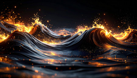 Dark, swirling liquid waves are illuminated by scattered golden sparks and glowing light.