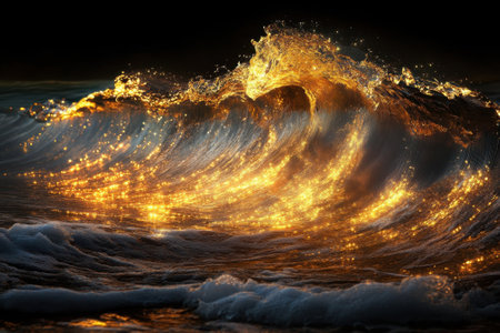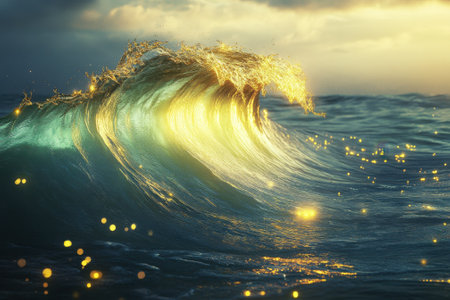 A glowing wave shines gold at sunset, creating a magical atmosphere with sparkling reflections.