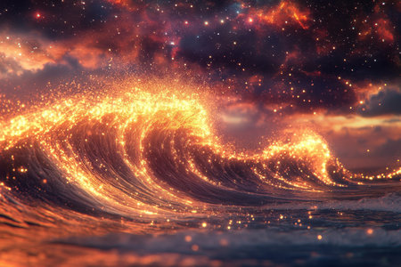 illustration of a stormy sea with glowing waves and golden lights
