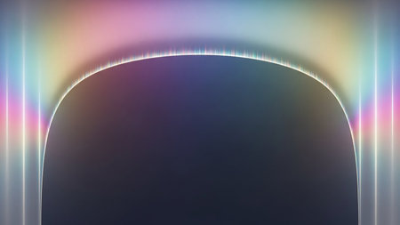 An abstract archway shape with soft rainbow colors and a glowing light effect against a dark gradient background.