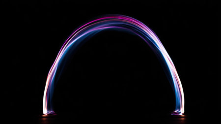 An abstract composition features curving light trails forming an arch against a dark background. The image showcases luminous streaks in shades of blue, pink, and white, creating a sense of movement. Suitable for graphic design projects, this vibrant visual offers space for creative applications.