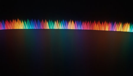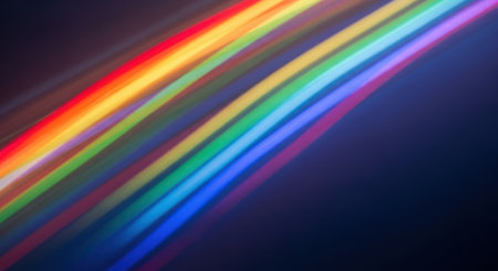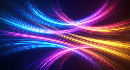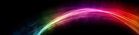 Dynamic abstract composition featuring vibrant rainbow light streaks flowing across a dark backdrop. Captures a sense of energy, motion, and spectrum of colors.