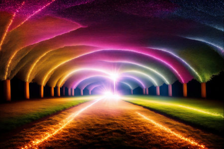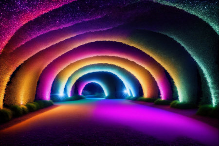 Vibrant led art tunnel with neon fireworks lights at urban night festival captivating visitors
