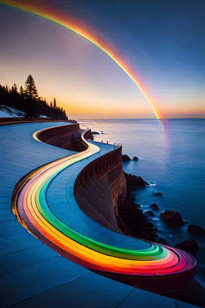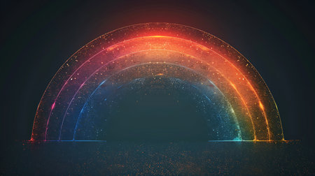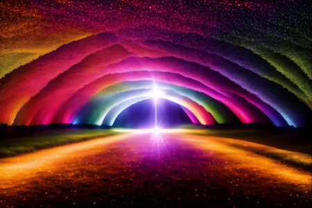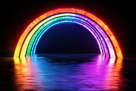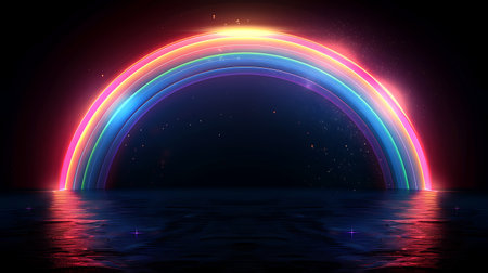 A rainbow arch is lit up in the dark. The rainbow is surrounded by water and he is floating. The colors of the rainbow are bright and vibrant, creating a sense of joy and happiness