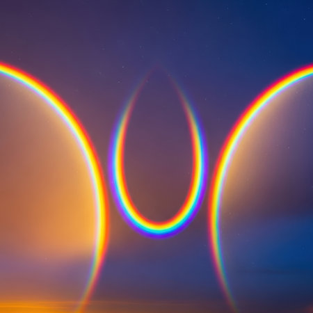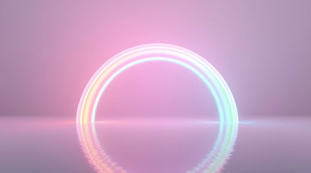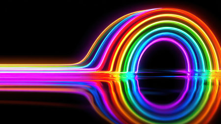 Symmetrical rainbow neon light arch with perfect mirror reflection creating stunning visual effect on black background in contemporary digital art.
