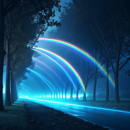 A dark, misty forest road is illuminated by multiple glowing rainbow arches that stretch across the scene. Tall, silhouetted trees line both sides of the asphalt path, their branches creating a canopy overhead. The road itself reflects the vibrant blue and rainbow light, creating streaks of color. The atmosphere is mysterious and dreamlike, with a sense of magical illumination.