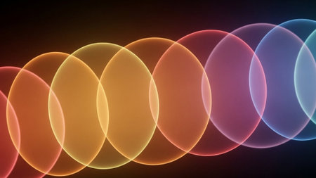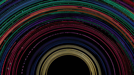 This image presents an abstract composition of overlapping arcs in various colors including green, red, and blue. The design is set against a black background, with the arcs creating a sense of depth and movement. It could be used for various design projects and digital art applications.