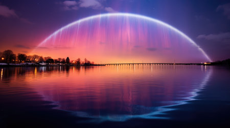 A striking neon arc stretches across a tranquil water surface during twilight, emitting vivid hues of blue and pink, creating a breathtaking display.