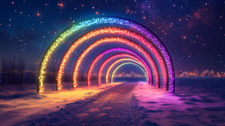 A stunning night scene showcasing a vibrant pathway adorned with colorful lights, leading through a snowy landscape under a magical starry sky.