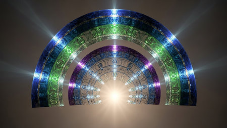 A luminous, multi-colored archway with intricate geometric patterns and radiating light beams against a soft gradient background.