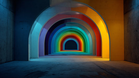 This striking image features a colorful light tunnel composed of vibrant arches that create a surreal atmosphere. Perfect for artistic projects or backgrounds.