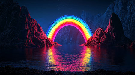 A stunning neon rainbow arches over a dark mountain landscape, reflecting beautifully in the serene water below, creating a magical and tranquil ambiance.