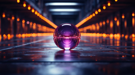This image showcases a vibrant glass sphere surrounded by neon lights and reflections, creating a captivating atmosphere in a dark and modern space.