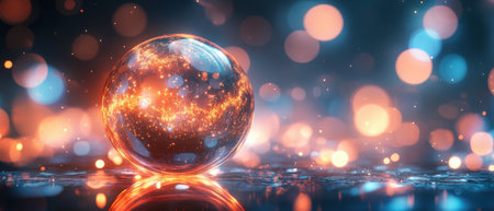 Glass energy abstract sphere with particles and glowing lights on a dark background.