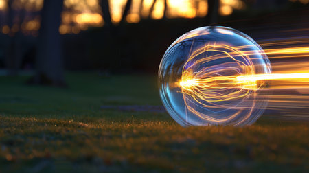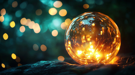 A glowing orb in an outdoor setting surrounded by blurred bokeh lights, creating a magical and ethereal atmosphere perfect for creative and conceptual designs.