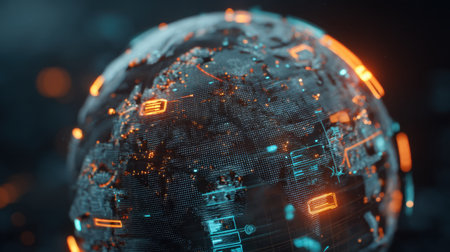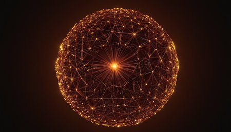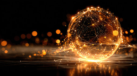An illuminated digital sphere, composed of interconnected lines and particles, floats against a stark black backdrop. The image features a warm color palette with gold and orange hues. The style hints at a futuristic concept, potentially suitable for presentations about technology, networks, or global connections. It is suitable for commercial and editorial purposes.