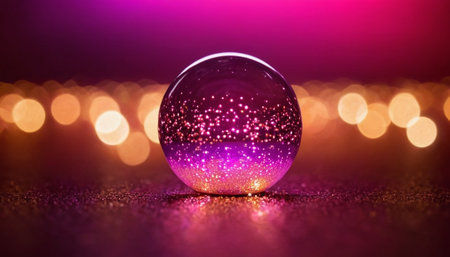 A luminous orb sits on a reflective surface surrounded by colorful bokeh lights creating a magical and vibrant atmosphere.