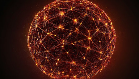 A digital sphere comprised of interconnected lines and illuminated points is depicted against a deep backdrop. The composition showcases a network of vibrant red and blue hues, creating a visually dynamic effect. This image's stylistic elements may lend themselves well to illustrating topics related to technology or data.