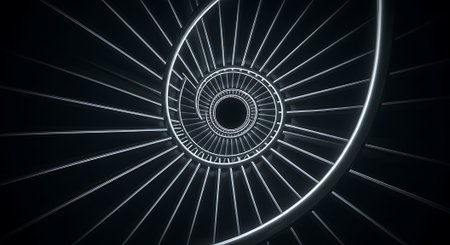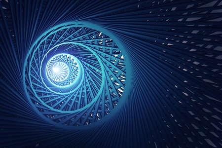 A mesmerizing abstract view of a glowing spiral staircase tunnel with radiating light lines against a dark background.