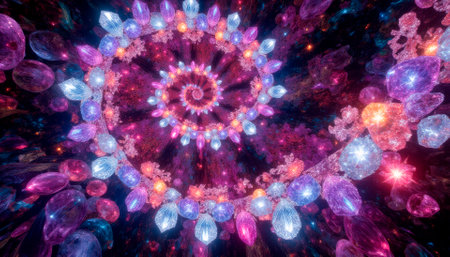 gorgeous complex spiral of diamonds and gemstones unwinding, top view.