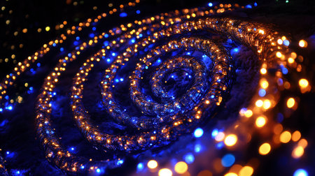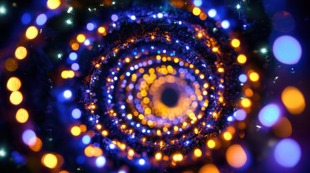 Colorful Christmas lights are arranged in swirling patterns, creating an enchanting vortex that draws the eye at night.