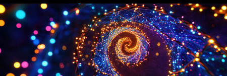 Abstract digital spiral with glowing golden and blue lights creating mesmerizing fractal pattern on dark background, representing data flow and futuristic technology concept.