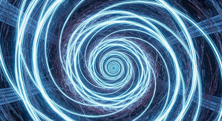 Vibrant glowing lines spiral inwards creating a captivating vortex pattern on a dark background. This visual metaphor conveys concepts of digital data streams and technological innovation.