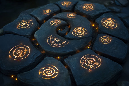 Spiral formation of polished stones, each etched with tiny symbols and glowing under black light on a smooth slate surface. Generative AI