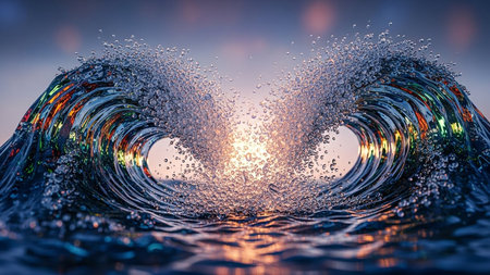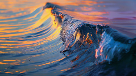 A close-up view of a dynamic ocean wave, showcasing vibrant colors reflecting a sunset, with splashes of water creating a serene atmosphere.