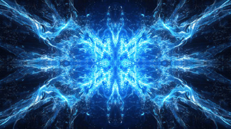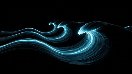 Electric blue neon waves with glowing light streaks and motion blur crash dynamically against a dark black background creating an energetic visual.