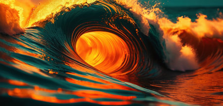 A vivid ocean wave combines bright teal and fiery orange hues during sunset.