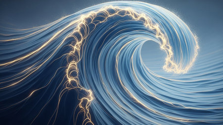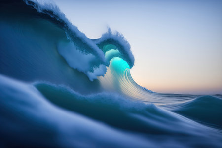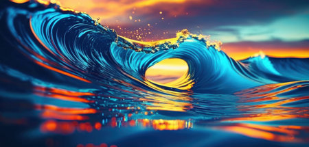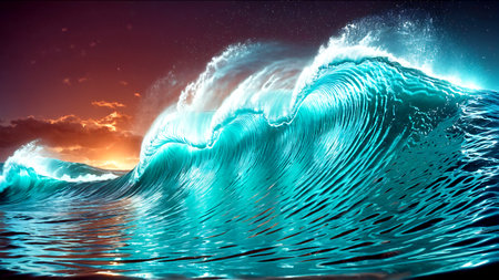 An illustration depicts a large, luminous wave cresting in an ocean setting. The wave is predominantly blue with glowing edges. The composition suggests motion with detailed textures. A dusk sky with orange and purple hues provides the background, suitable for a range of creative projects.
