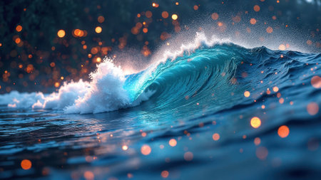 Dynamic ocean wave with sparkling bokeh lights at sunset. That the image is generated using AI.