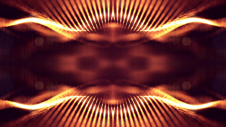 3d rendering background of microworld or sci-fi theme with glowing particles form curved lines, 3d surfaces, grid structures with depth of field, bokeh. Golden red wave symmetric forms
