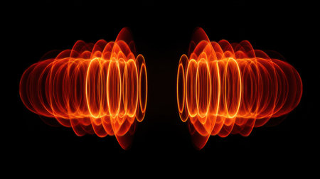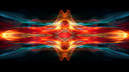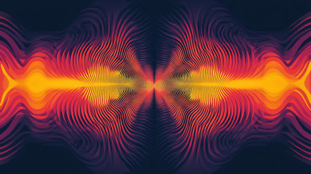 Symmetrical mirrored waveform pattern in vivid orange and red tones on a pure black background.
