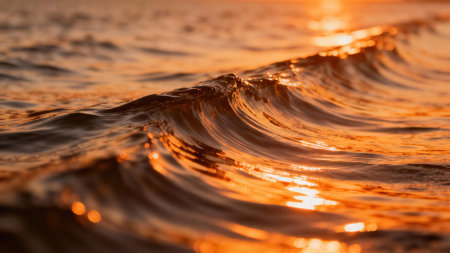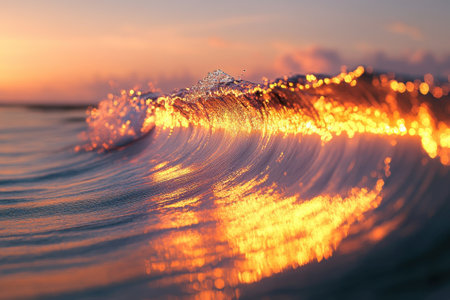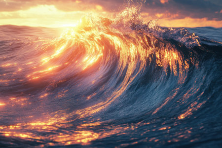 Close-up of a powerful ocean wave cresting and breaking at sunset or sunrise. Golden light illuminates the water's movement and intricate patterns, showcasing nature's beauty and dynamic energy.