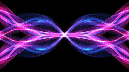 Vibrant blue and pink light streaks create an abstract design on a dark background,.