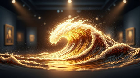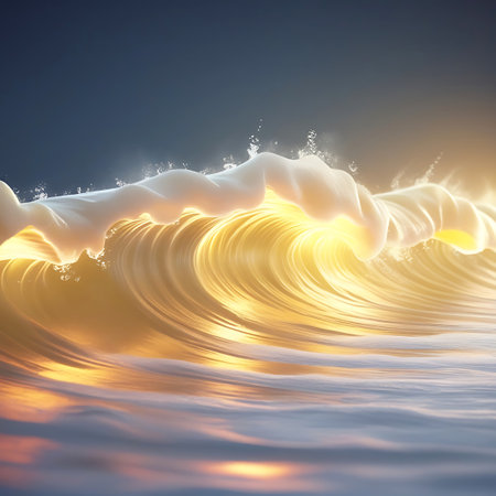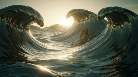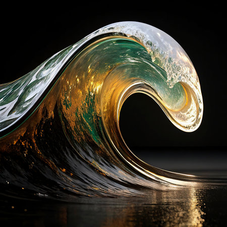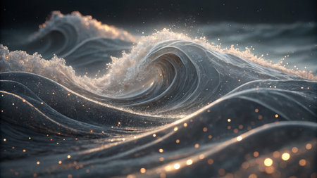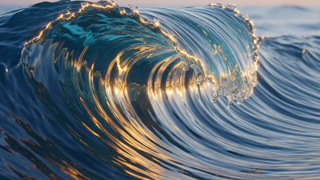 Close-upofdynamicoceanwaves.Themainfocusisacurvingwavewithfoamandgoldenlights.Backgroundisdark,possiblytransparent,showingsuggestionsofotherwaves.Theatmosphereiscalm,serene,andmagical.Theimage evokesfeelingsofpeaceandwonder.