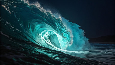 Powerful wave crests in ocean with teal glow, revealing nature's raw energy.