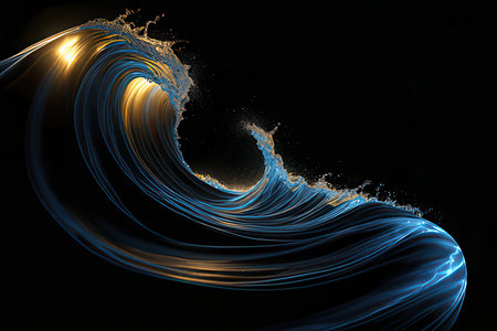 Blue and yellow glowing wave with foam on black background. Energy. Nature power