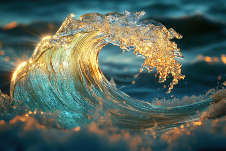 A powerful ocean wave rises dramatically, capturing the sunlight's golden glow as it crashes. The water displays vibrant turquoise hues, reflecting the enchanting beauty of nature at dusk.